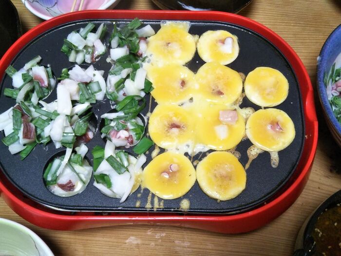 ②小麦粉を少量の水で溶き、冷めた手順①のだし汁を少なめに加える→溶き卵を少しずつ加える→タコを加える。