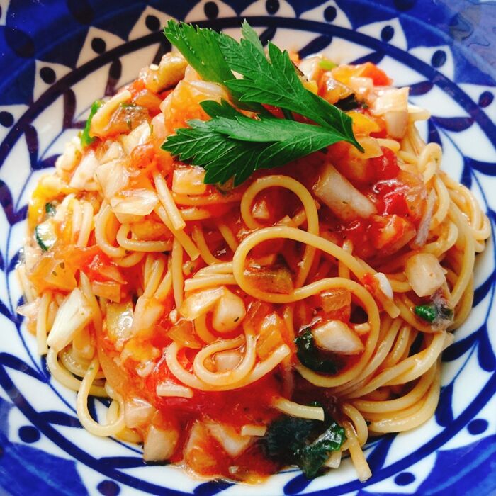 お好みの冷凍パスタ(ペペロンチーノ)をレンジで温めボウルに入れトマトソースを大さじ1.5~2