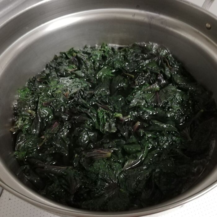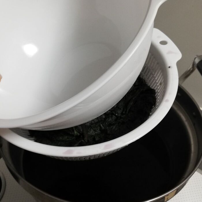 鍋に水を沸かし沸騰したら、赤紫蘇を投入〜