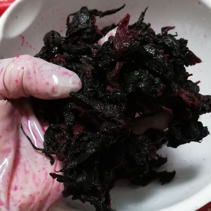 ザルにあげたら、その上にボールをおいて赤紫蘇を挟んで絞ると熱いうちに絞れます。