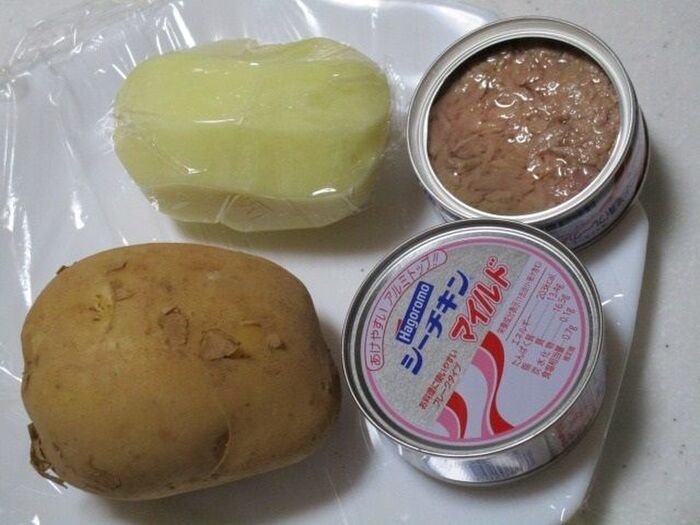 ステップ①:じゃが芋は、皮をむき、ラップでくるみます