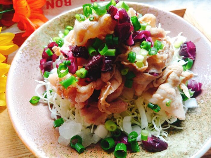 7.皿に5のサラダを盛り6の豚肉をのせて完成。お好みで青ネギを散らして