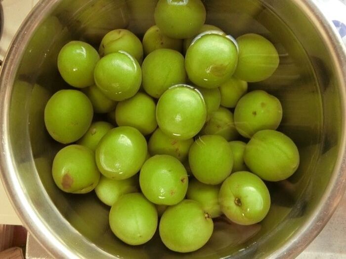 梅はさっと洗い、半日水につけておきます。水気をしっかり拭き取ったら、串で梅のへたをとります。