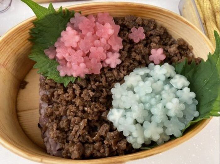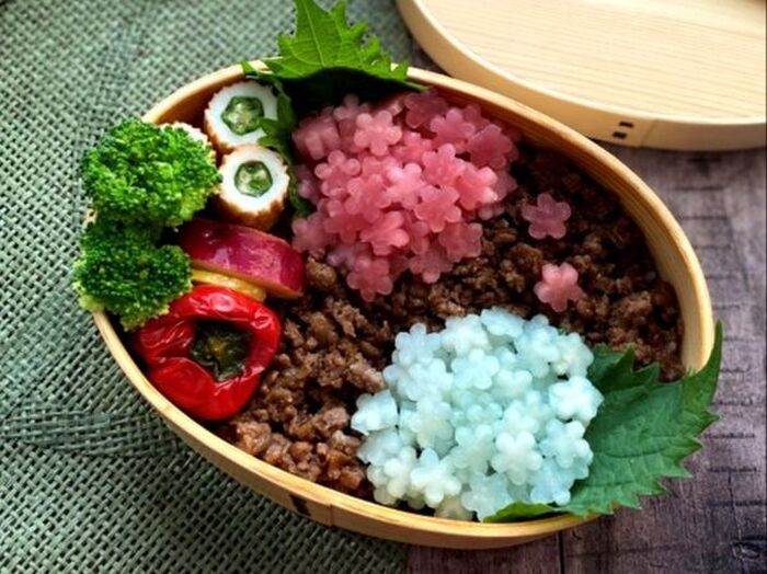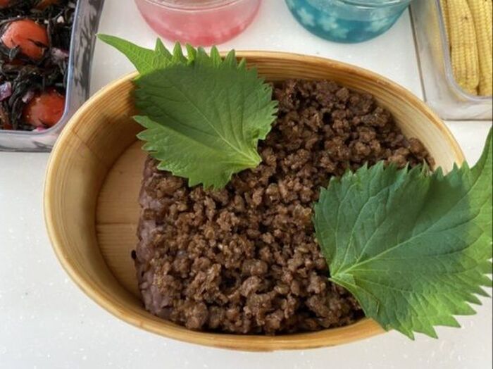 お弁当箱に 左に少しすき間をあけて ごはんを詰め上に肉そぼろを