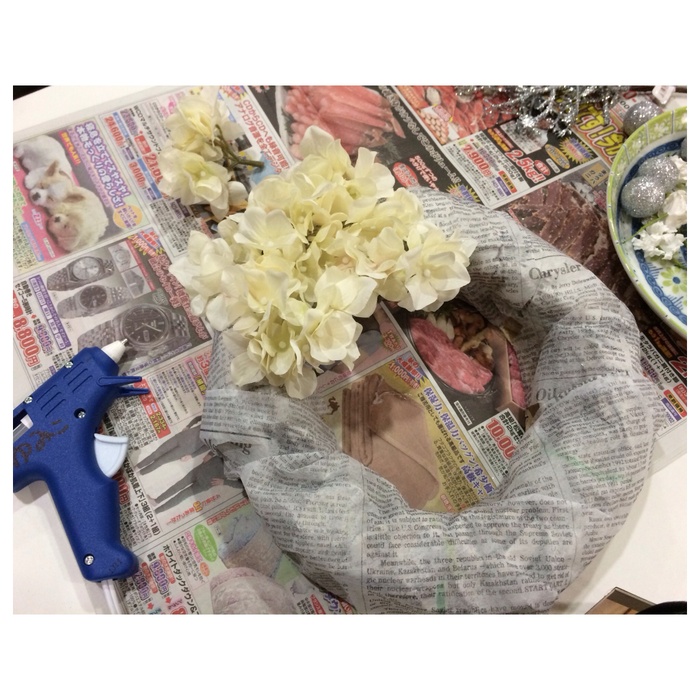 グルーガン。なければボンドで花をドンドンくっつけていく。