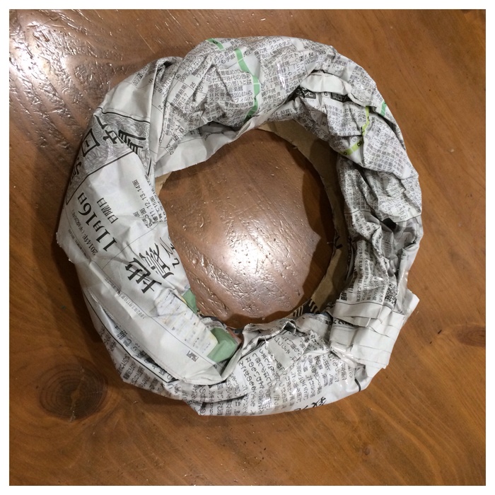 ダンボールリングの上に新聞紙の棒をひねりながら、重ねて、 テープで固定。