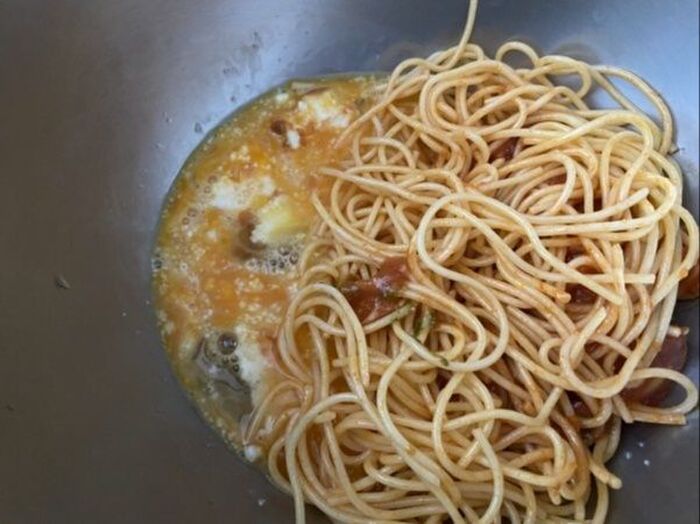ボウルに卵を溶きほぐし 粉チーズ半量とパスタを加えよくかき混ぜます
