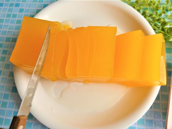 食感は、固めのゼリーです。味は、果汁100%のオレンジジュースではなく、子供が好きなあっさりしたオレンジジュースの味です。
