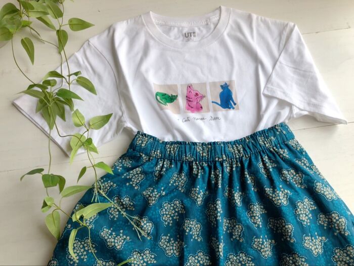 女性向きの大き過ぎないシンプルな形のTシャツでネコの色合いと表情がキュート♡定価990円が790円になっていて他にも違うデザインがありますよ♡