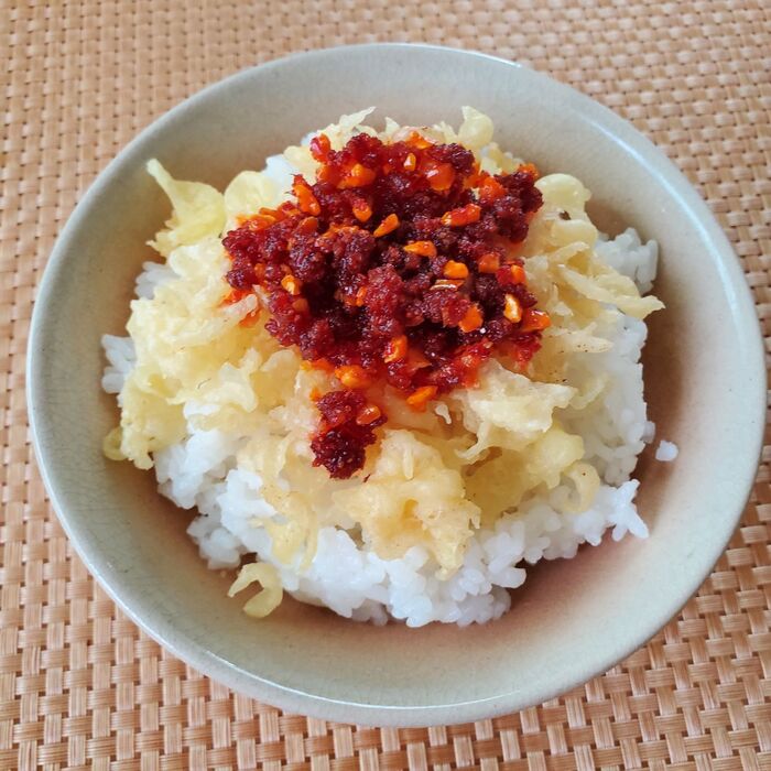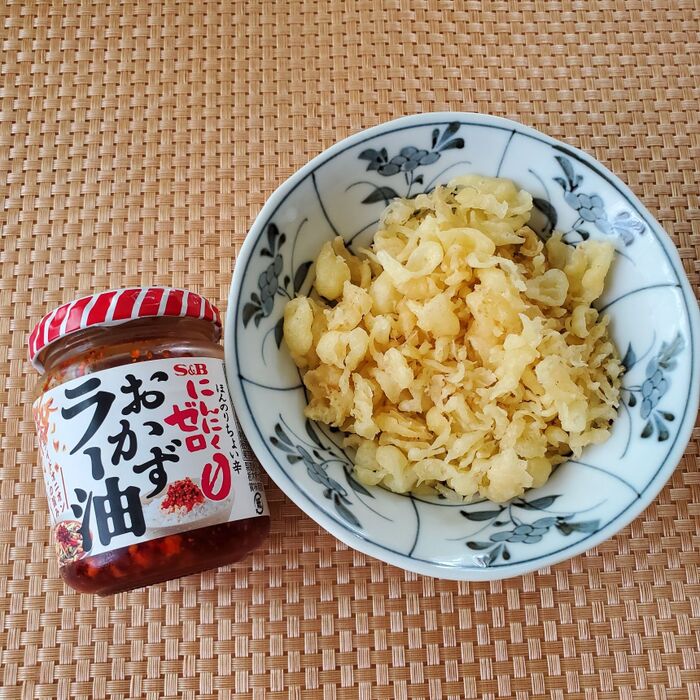 スーパーのお惣菜コーナーで格安で売っていることもありますし保存の効く揚げ玉でもオッケーです。