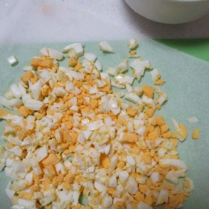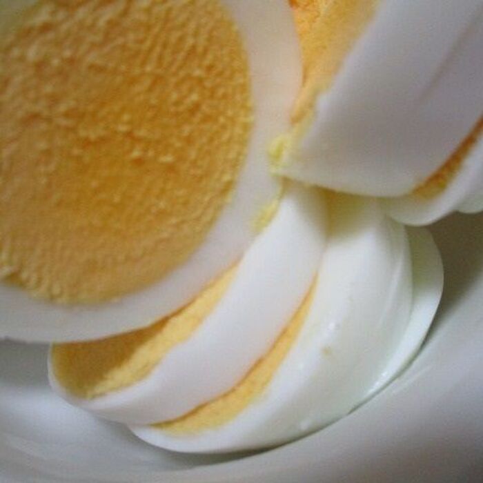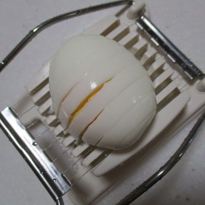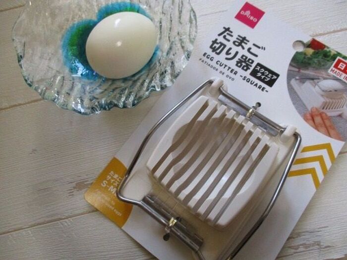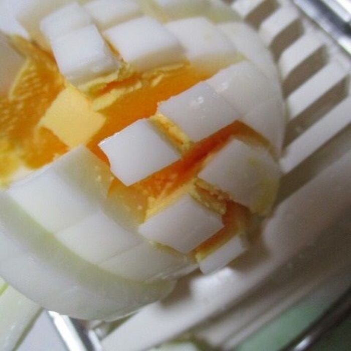 こんな、かんじで、固ゆで卵を横においてですね、上からかぶせて、押し切りスライスします
