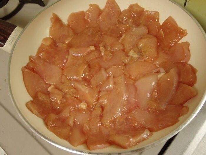 鶏胸肉は一口サイズのそぎ切りにすると取り分けやすいです。
