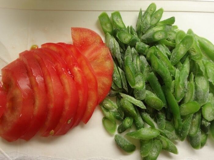 トマトは薄切りにし、いんげんは斜めに薄切りにします。コーンはしっかり水切りしておきます。