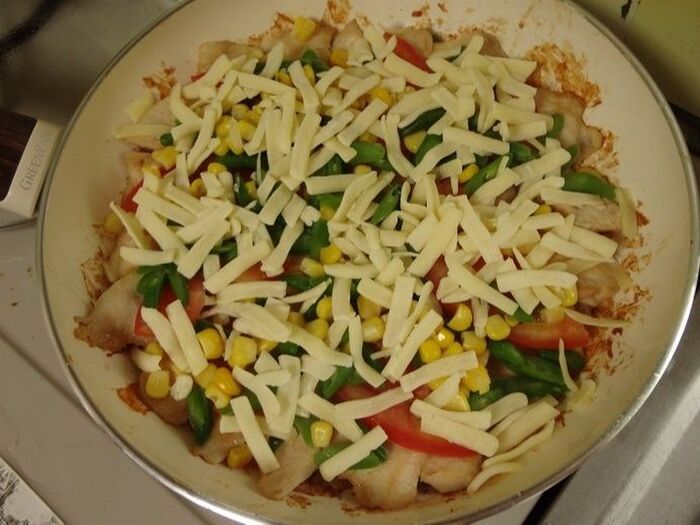 焼き色が付いたら裏返し、野菜とピザ用チーズを乗せてフタをして焼きます。