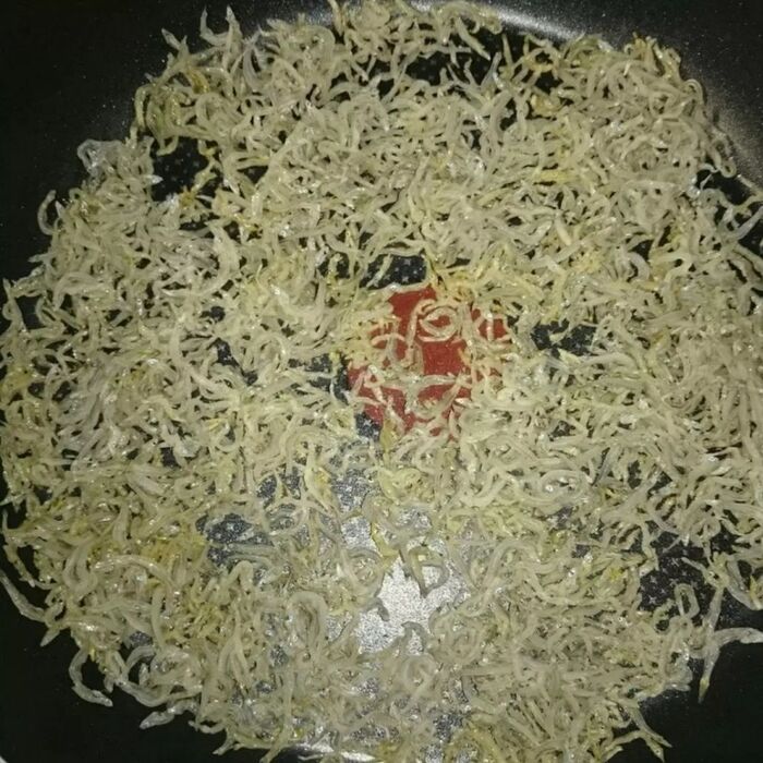 フライパンに、ごま油を回し入れ、ちりめんじゃこ投入~カリカリっと炒める〜♪