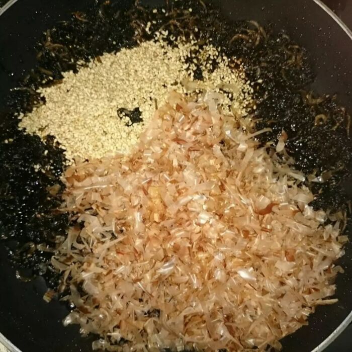 火を強くして、鰹節と入り胡麻投入して水分が無くなるまで炒めたら出来上がり〜♪
