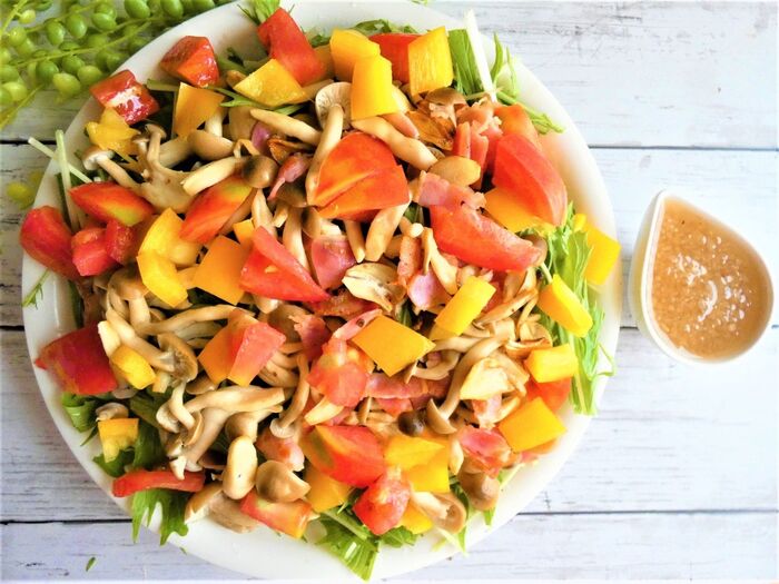 炒めたキノコ・ベーコン・ニンニクでサラダもボリューム満点!!夏バテ予防にいかがですか??