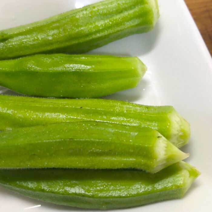 *オクラに塩をふって、まな板の上でコロコロと転がして、水で洗い流す。→産毛を取り除きます。