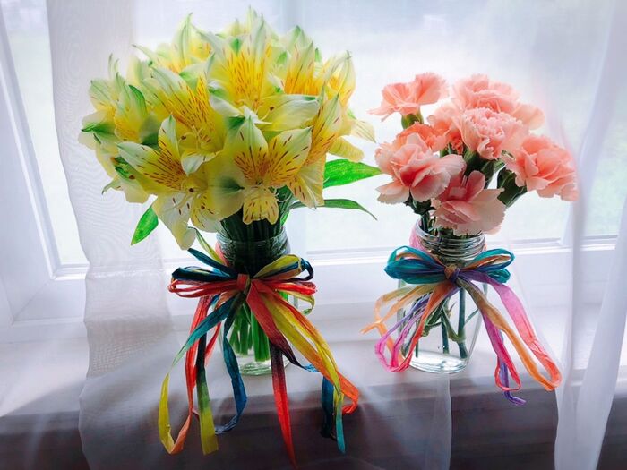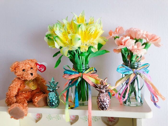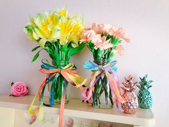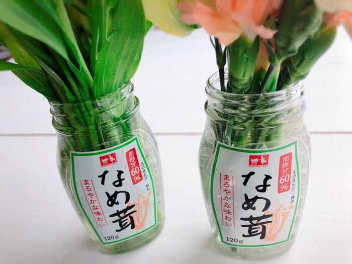 お花をもらい花瓶が足りなかったので空き瓶を使いました♡瓶の口にお好きなリボンやレースなどで可愛くして下さいね♡なめ茸の空き瓶は手作りジャムなど詰めるにも役立ちますよ♪
