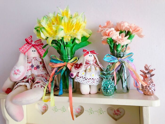 ハンドメイドのウサギドールと一緒に♡安定感があり季節の庭の花を飾るのにも使いやすい瓶ですよ♡