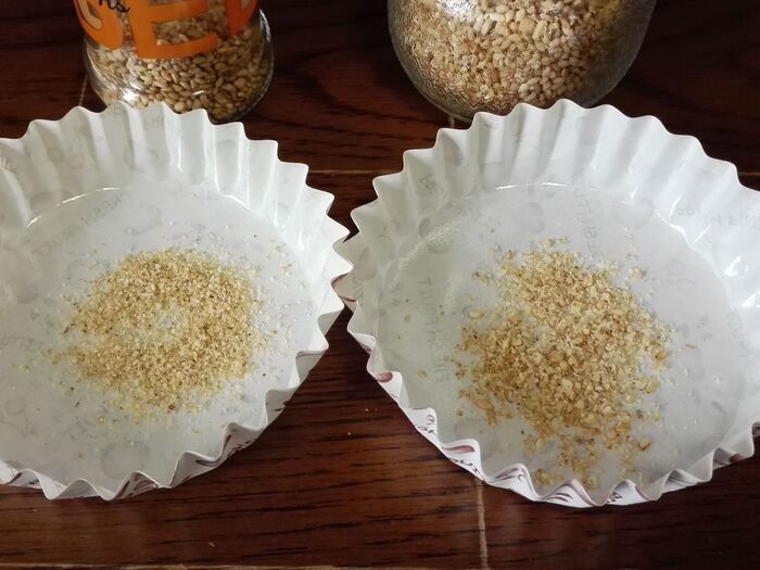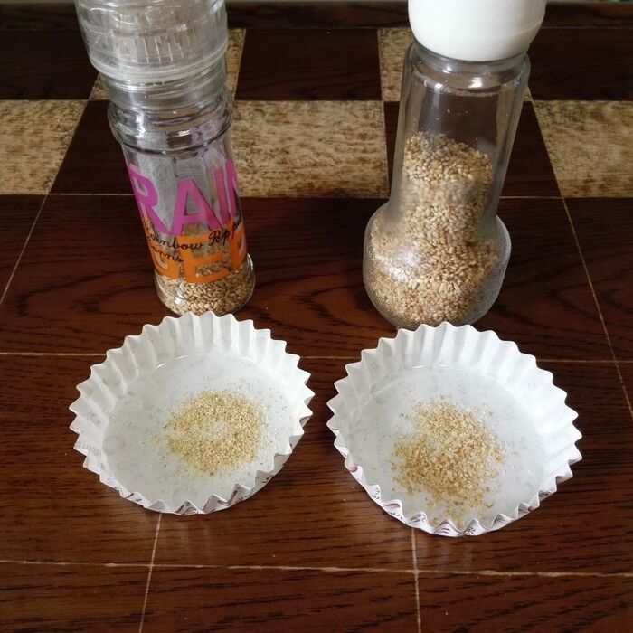 比較すると、摩っている時の香りも全然違う‼ ゴマのつぶも、ミル付きビンの方が細かくなっています!