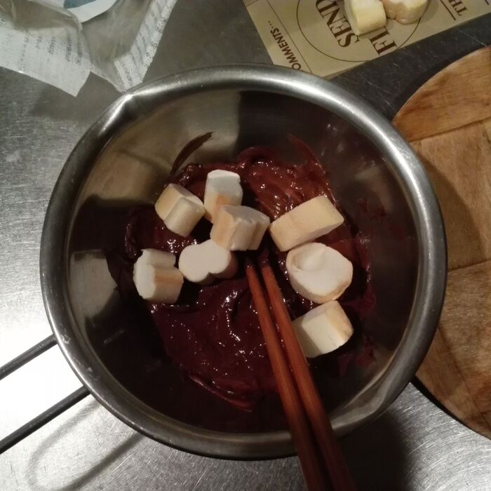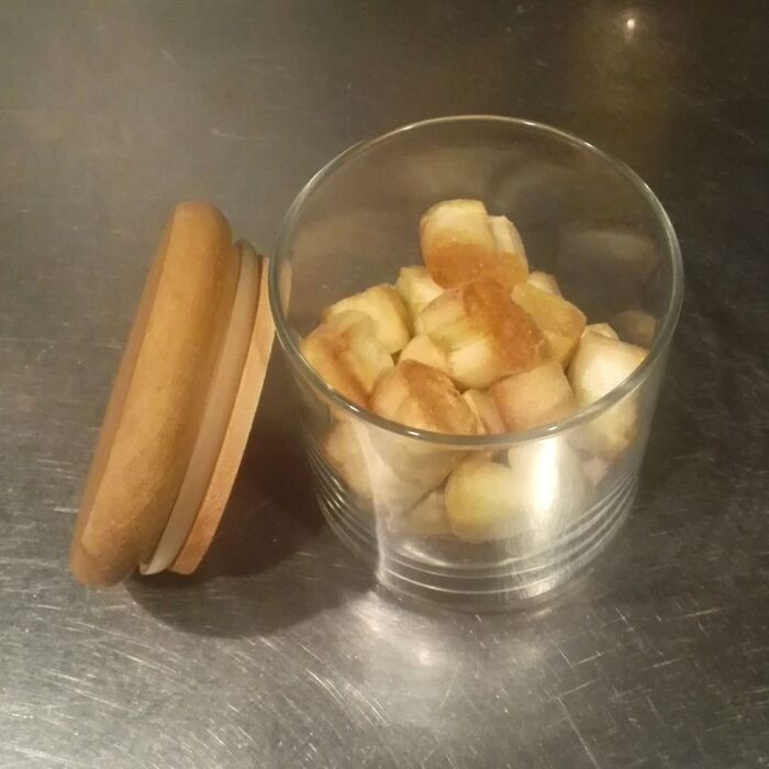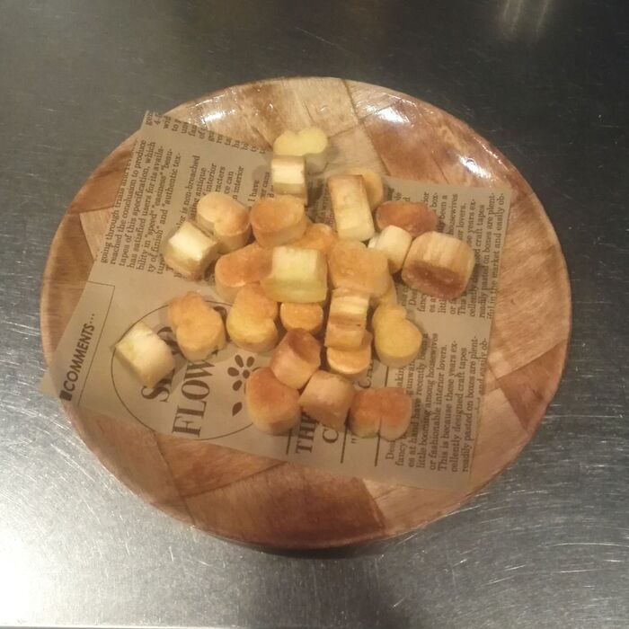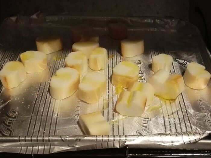 オーブンの天坂にアルミを敷き、おふを乗せたら軽く塩をふりかけオリーブオイルをまんべんなく垂らし5分焼くと
