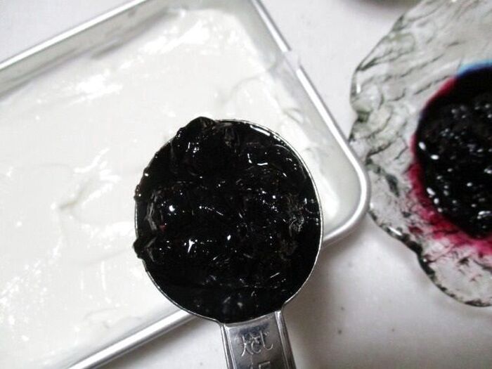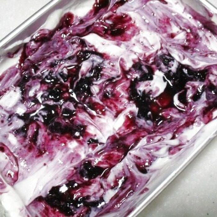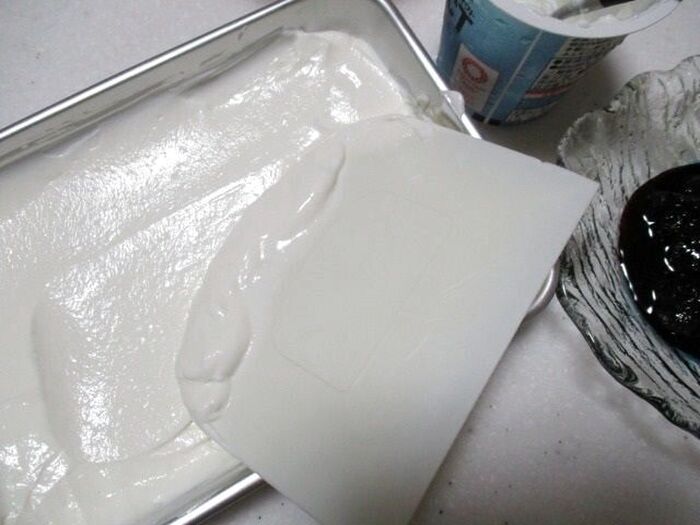 ブルーベリーヨーグルトをのせて、全体に広げ、ラップをして、冷凍庫で2時間以上凍らせます