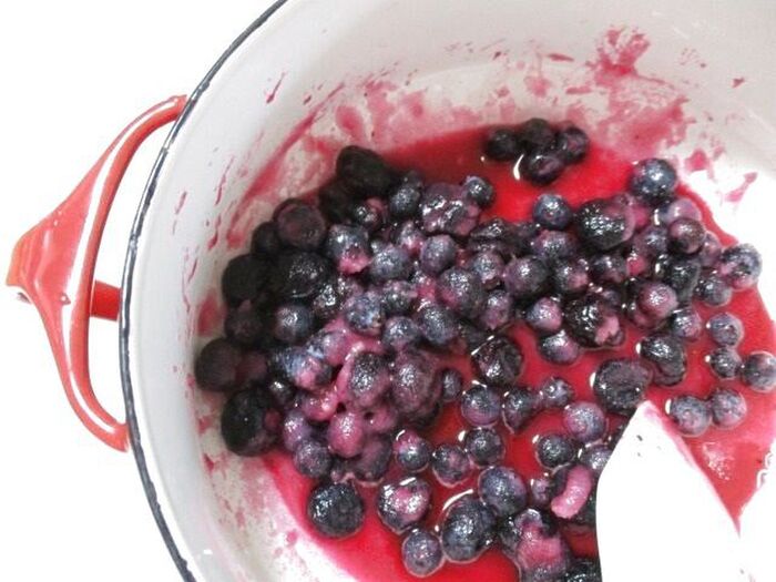 ブルーベリーを水で洗い、水気をペーパータオルなどでふきとり、鍋(ホーローの鍋使用)にブルーベリーと砂糖と、レモンの絞り汁を入れ、砂糖が全体に混ざるように、混ぜて、40分おきます