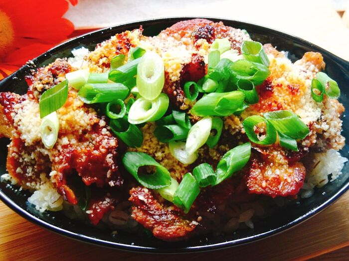 7.耐熱皿にご飯を敷き詰めて豚肉をたっぷり盛りつける