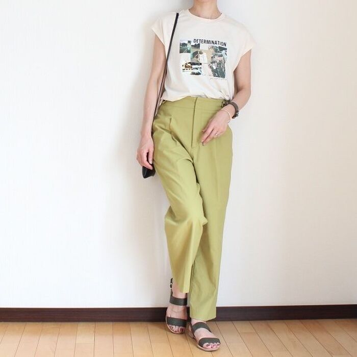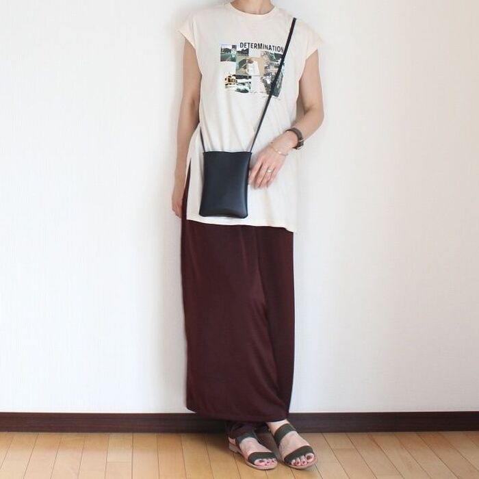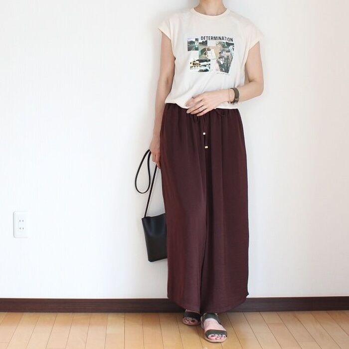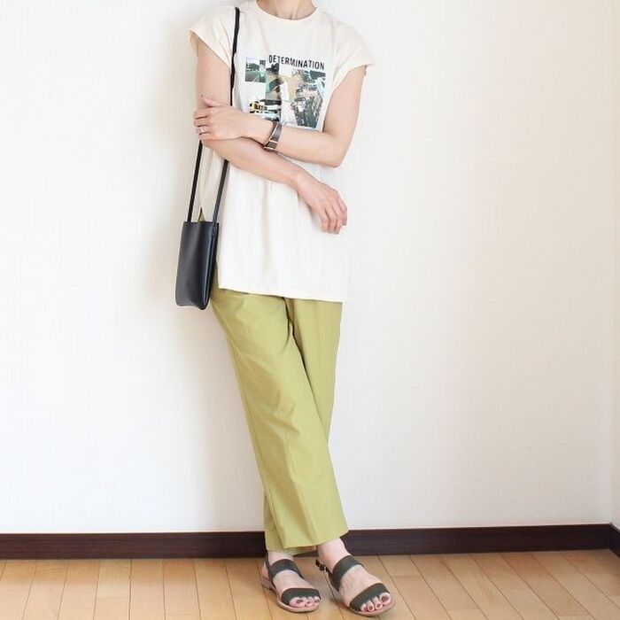 Tシャツがアイボリー色なので、ボトムスの色味と馴染み、シックにまとまる。