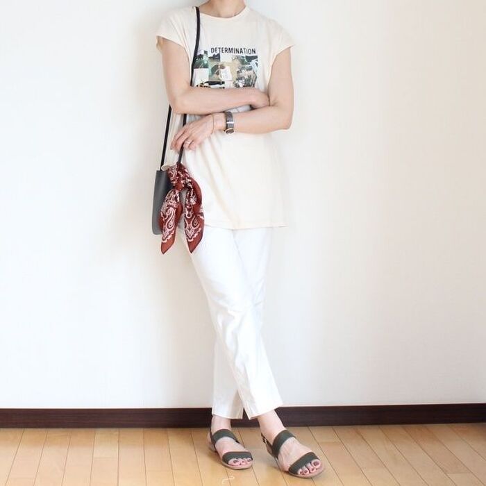 全体的に白っぽく間延びしてしまうのを、バッグにバンダナを