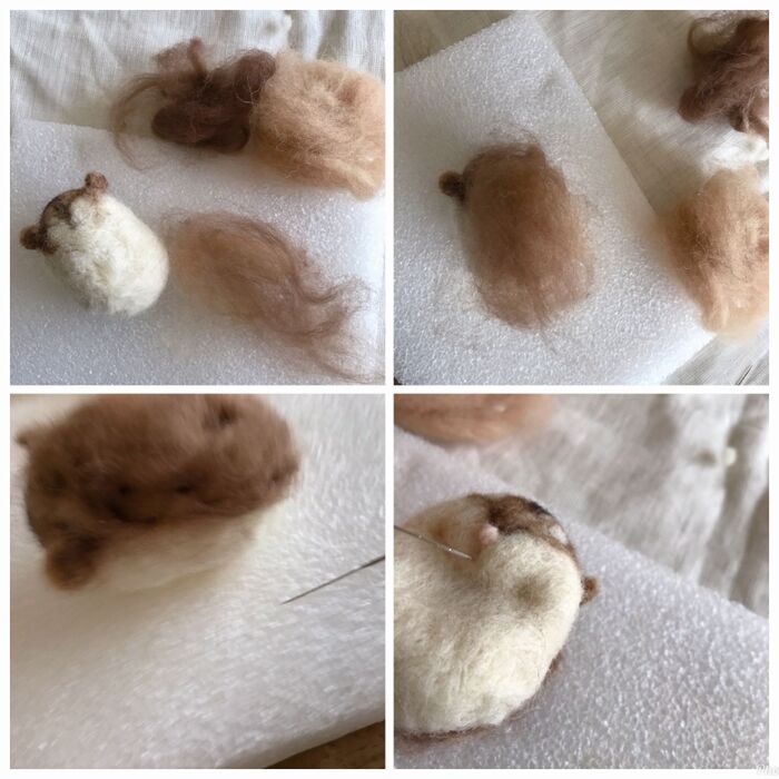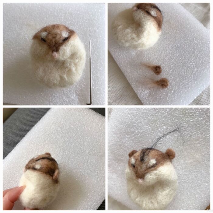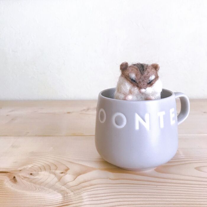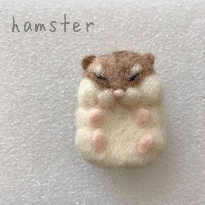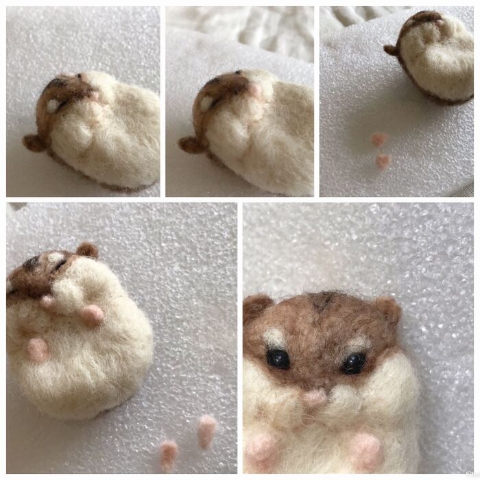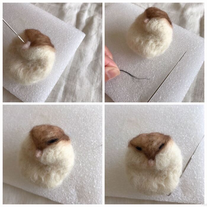 起きてるハムちゃんが良い方はプラスチックの目を入れてアイシャドウみたいに黒のフェルトを入れて少し目蓋で隠すと、写真みたいな感じになります。