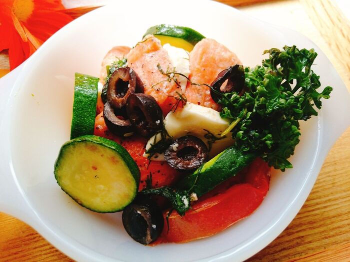 8.バットに鮭、トマト、ズッキーニを並べ、ディルの葉をちぎって加える