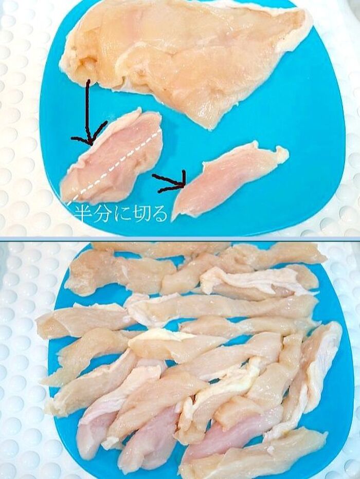 ①鶏むね肉は1cm幅にカットしてさらに半分にカットし、