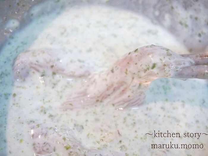 ④下漬けした鶏肉だけをボウルに入れ衣をつけ、