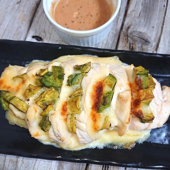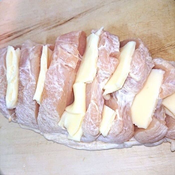 鶏胸肉の切り込みを開いていてモッツァレラチーズを入れ込む。