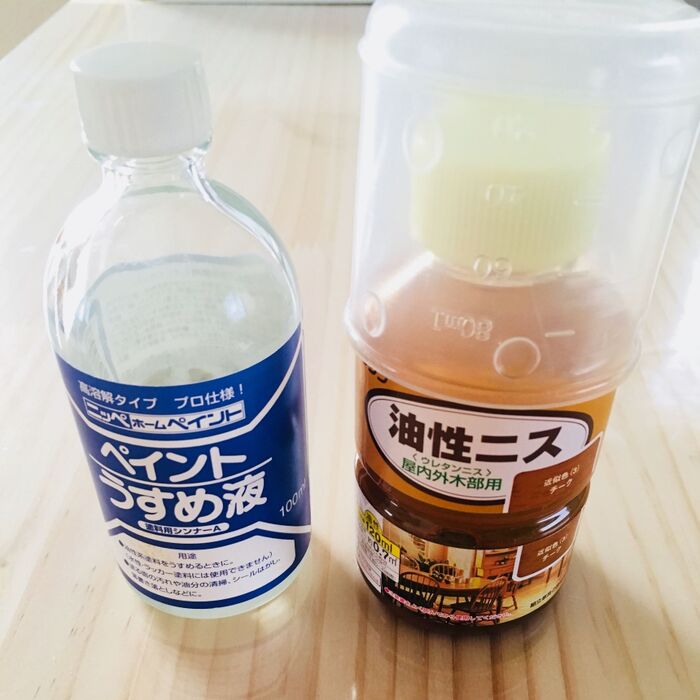 木材はこちらのニスを薄め液で薄めて色を付けています。※窓リフォームで残ったものを使用