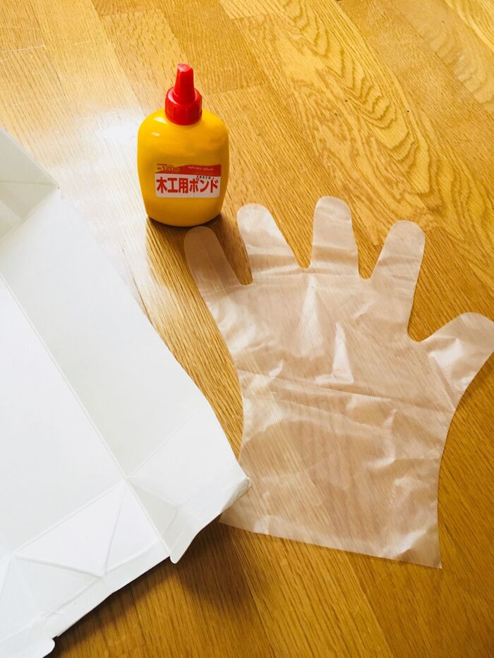 開いた牛乳パックに多めにボンドを出し、ビニール手袋で塗るとまんべんなく塗ることができました。