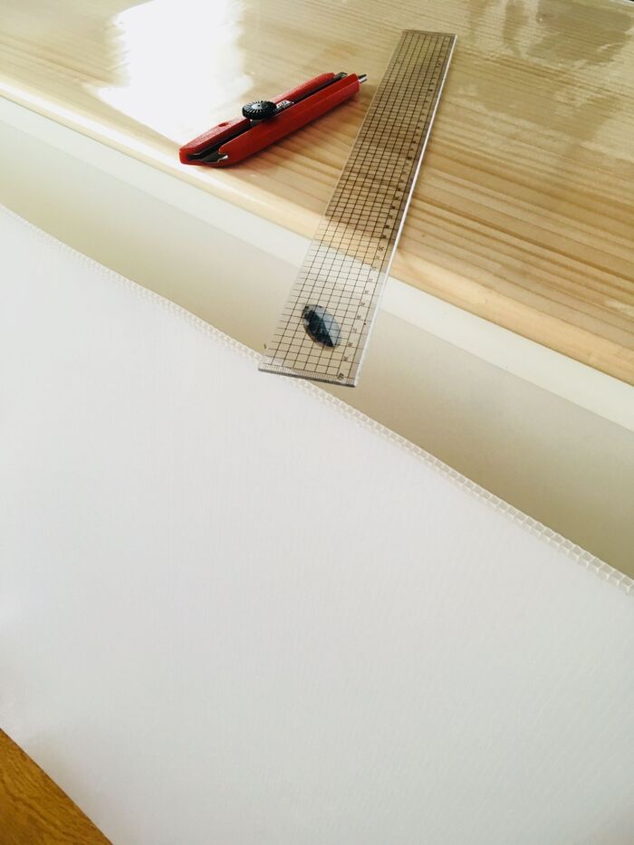 定規をあててカッターで切れば簡単に切れます。強度を上げるため縦方向に使っています。
