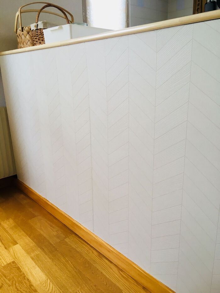 今回は白のヘリンボーン柄の壁紙を選びました。送料はかかりますが、ネットでのりなし90×1m400円弱で購入できます。