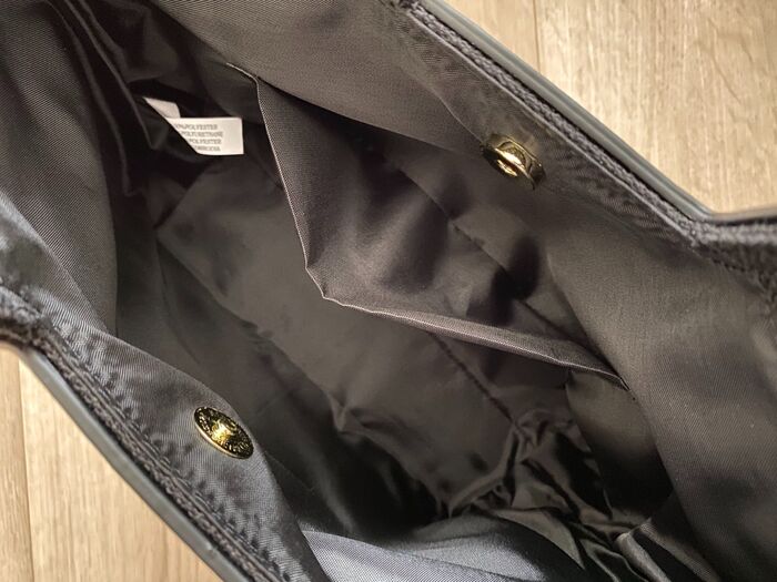 私が買った「ブラック生地×ブラックのハンドル」の他に、「オフホワイト生地×キャメル色のハンドル」と「ベージュ生地×ホワイトのハンドル」があり、全3色展開でした。