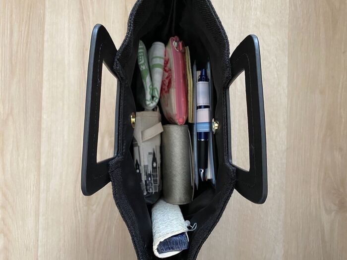 ちなみに、この写真では「ハンカチ、文庫本サイズの手帳、財布、エコバッグ、小さめのメイクポーチ、マスクケース、扇子、家の鍵(ポケットの中)」を入れています。