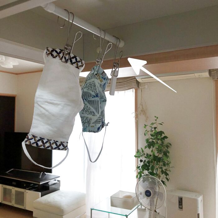 最後に、マスクはワイヤークリップで止めて突っ張り棒に引っ掛けて干しています。