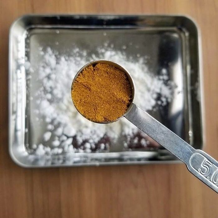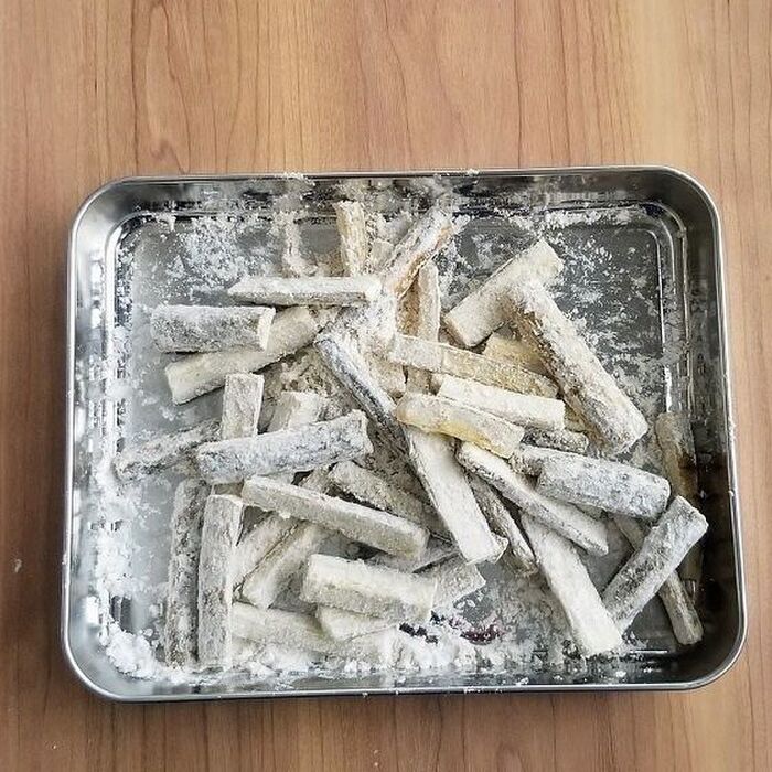 バットに片栗粉を広げ、ガラムマサラ、塩、ガーリックパウダーを加えて、よく混ぜる。