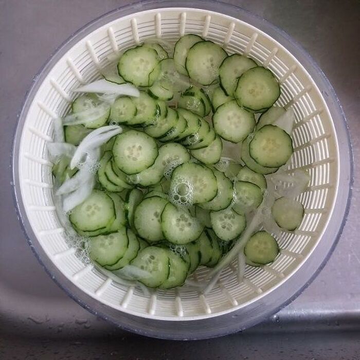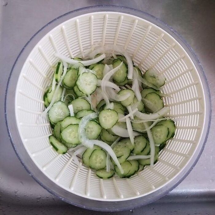 きゅうりと玉ねぎの水分はしっかりと絞ります。