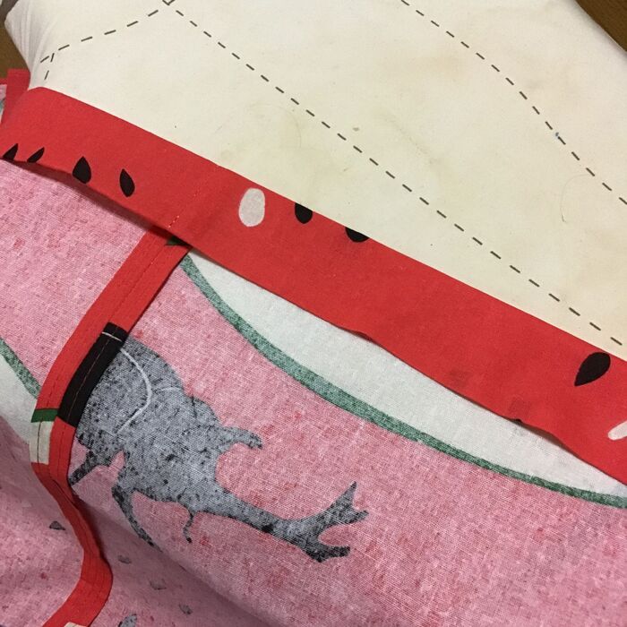 つなげた手拭いの端と端を中表(柄が内側になるように)で縫います。