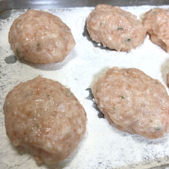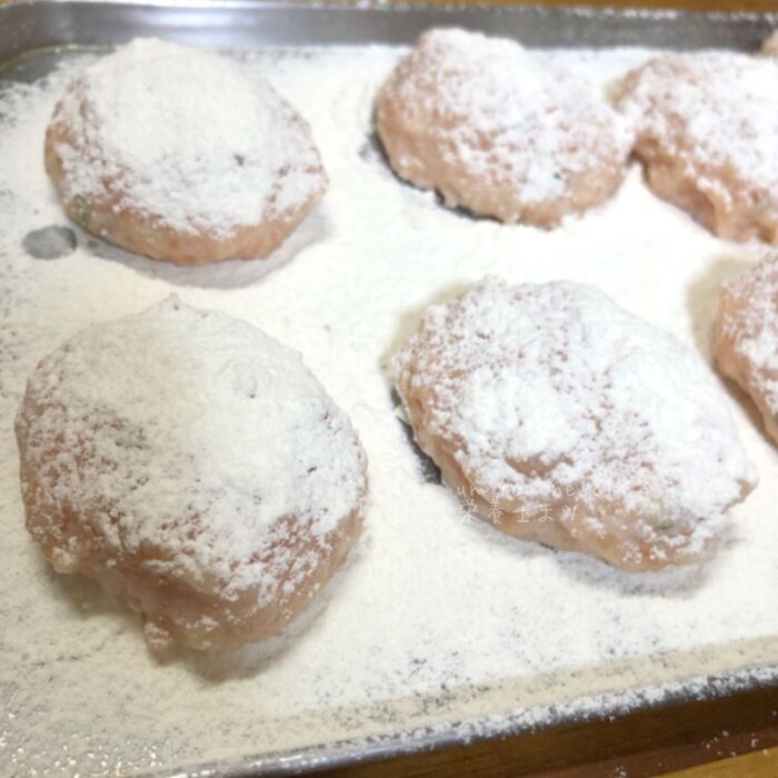 鶏ミンチとにんにく・ローズマリー・☆をよく混ぜ合わせて8等分にし、薄力粉をひいたバットの上にのせ、上からも粉をふるってかける。