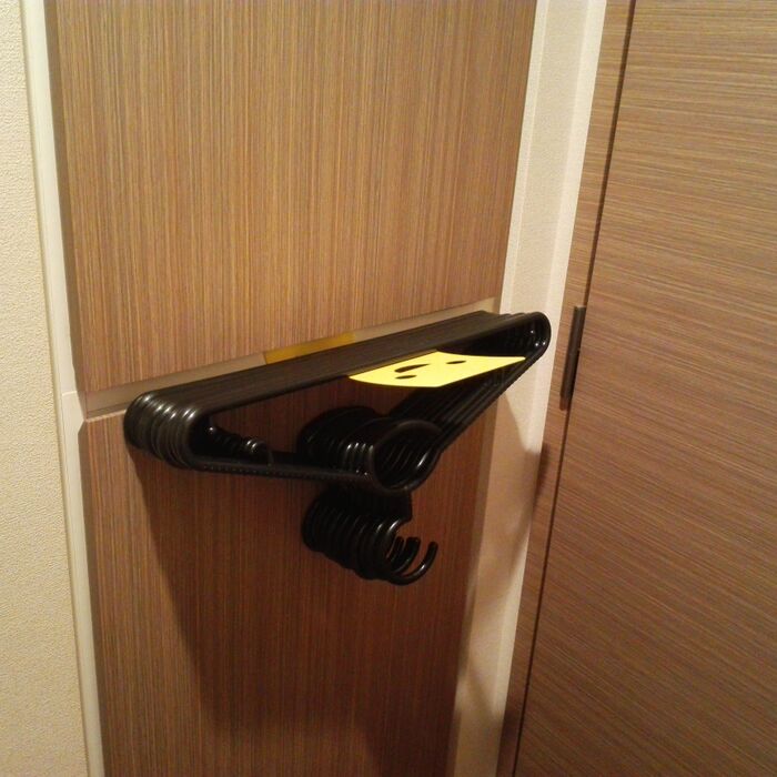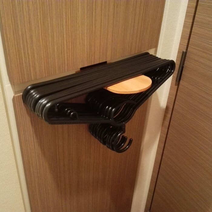 新品のタオルやバスタオルを入れているので、ほとんど開閉しない洗面場の収納庫の扉に挟むだけ🎵