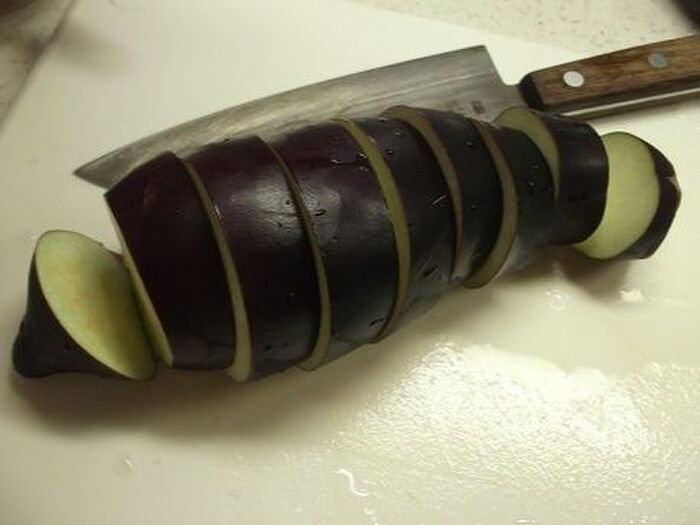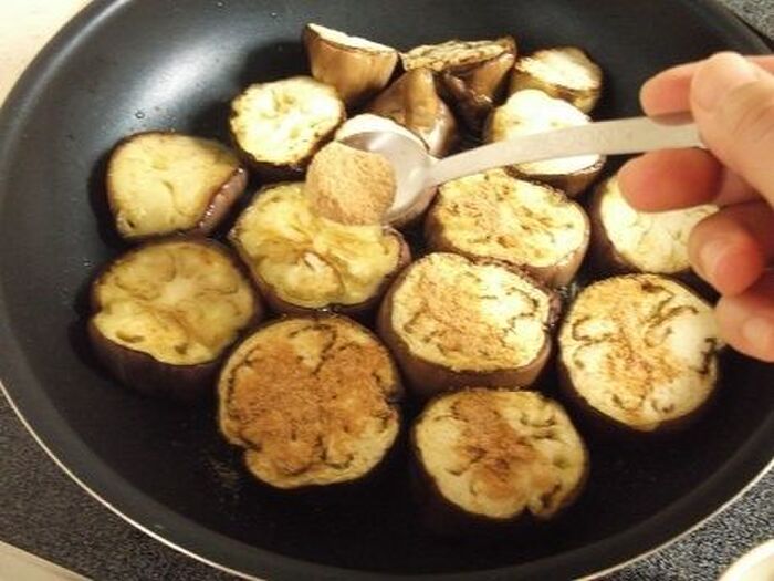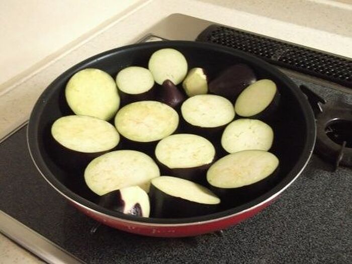 火にかけていないフライパンに米油を入れ、2cm幅くらいの輪切りにしたナスを並べる。