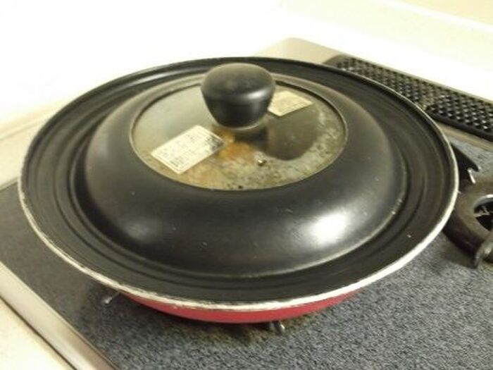 蓋をして中火にかける。ジューッと音がし始めたら、ごく弱火で10分蒸し焼き。